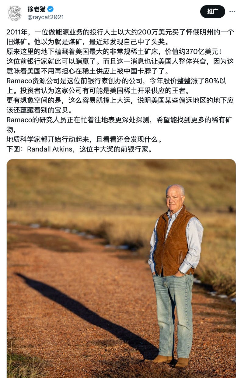 去年11月9日,《华尔街日报》发表了一篇关于Ramaco怀俄明矿区发现稀土元素矿的文章,产生了极大的轰动效应(The $2 Million Coal Mine That Might Hold a $37 Billion Treasure)。这件事我也在推上曾介绍过。
