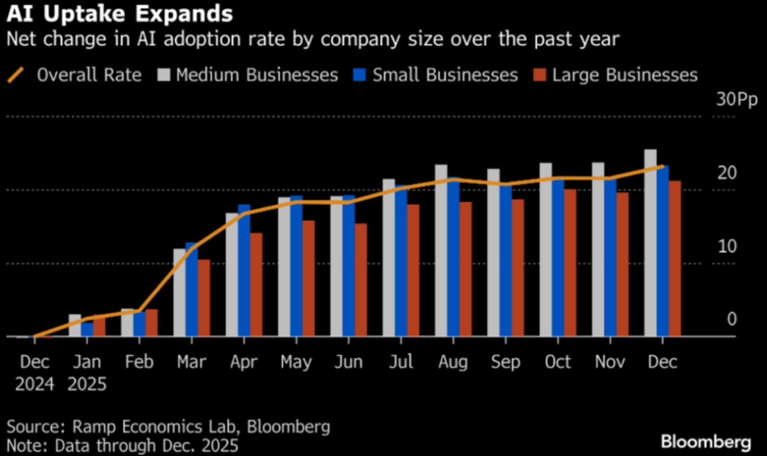 今早有权威数据显示,美国企业对AI的采用率在去年12月份飙升至历史新高,打破了8月至11月长达数月的停滞。