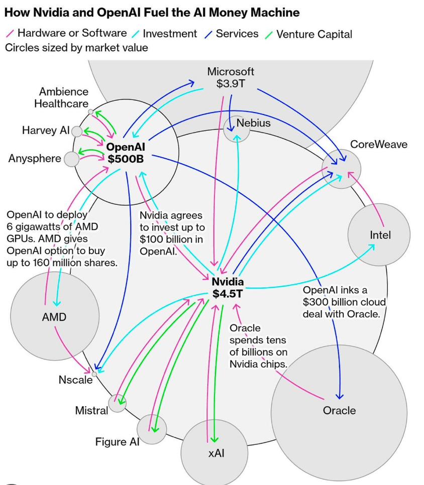 如今,类似的融资担忧导致投资者抛售AI概念股,尤其是英伟达(NVDA),因为资金在AI建设领域陷入了内循环。