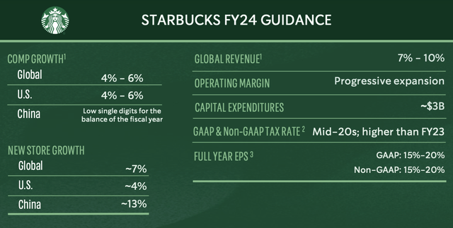 2024年1月30日,星巴克公布了2024财年第一季度的业绩,总体而言相当积极。全球门店销售额同比增长5%,综合净收入同比增长8%。中国是星巴克最赚钱的市场之一,第一季度新开的590家门店中有超过13%在中国。目前美中两国是星巴克两个最大的市场,在中国就有近7000家门店,产生了总收入的约20%。