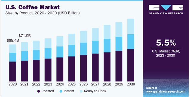 2022年,全球咖啡市场规模达到4612.5亿美元,预计2023年至2030年复合年增长率为5.2%。全球范围对咖啡的强劲需求是毫无疑问的,咖啡已成为全球消费最多的饮料之一,呈显著上升趋势,尤其是在亚太地区等新兴市场。随着人们可支配收入的增加、消费者生活方式的变化,咖啡文化会进一步深入人心,成为一种普遍的日常休闲享受。星巴克作为这里领域里的顶尖品牌,也会直接受益于这个消费趋势。下图为美国咖啡市场的增长预估。