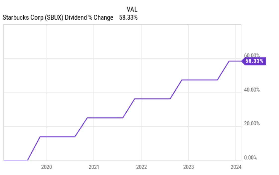 从股价增值和股息两方面考虑,2010年最初投资1万美元在星巴克,中间将股息不断再投资,则现在值10.5万美元,相当于复合年增长率为18.4%。单从股息收入考虑,从仅157美元增加到2,352美元。那么星巴克未来还能提供如此可观的回报吗?
