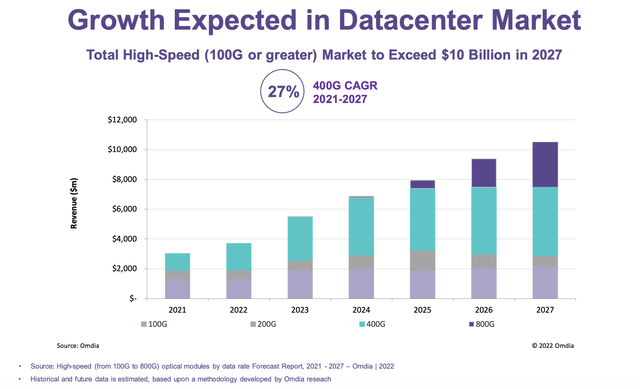 数据中心市场正是目前的热点,投资者因此对它充满期待。随着未来几年全球数据中心领域出现显著增长,光模块领域预计到2027年将从今年的约65亿美元增长到100亿美元以上。这仅是高速(定义为100G及以上)光模块领域。目前数据中心市场正在从100G和200G单元向400G单元转变,2021年至2027年的年化增长率将在27%左右。明年晚些时候预计会进一步向800G转型。