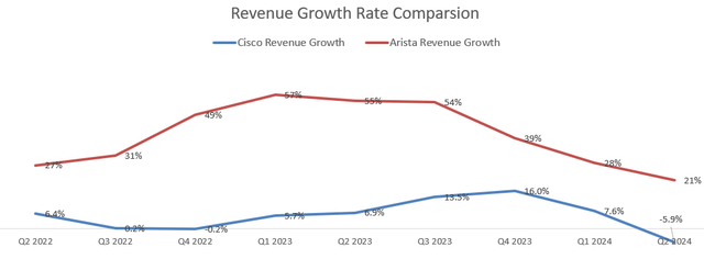 如果从主观方面看,更反映了深层次的问题:业务高度依赖传统的网络IT支出,而在AI、云计算和数据中心网络等高增长领域基本上缺位。下图显示了思科和Arista之间的收入增长情况,后起之秀Arista从思科等传统厂商那里抢到了很大的市场份额。在最近一个季度,Arista预计2024财年收入增长10%-12%,主要是由AI和数据中心网络业务所推动。思科在高增长市场中缺乏强大的产品组合拳,这是投资者不看好的主因。