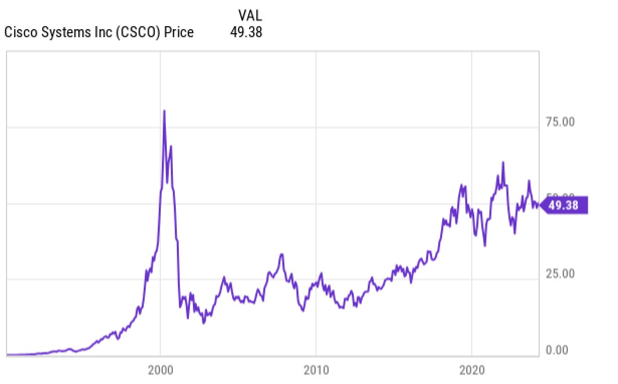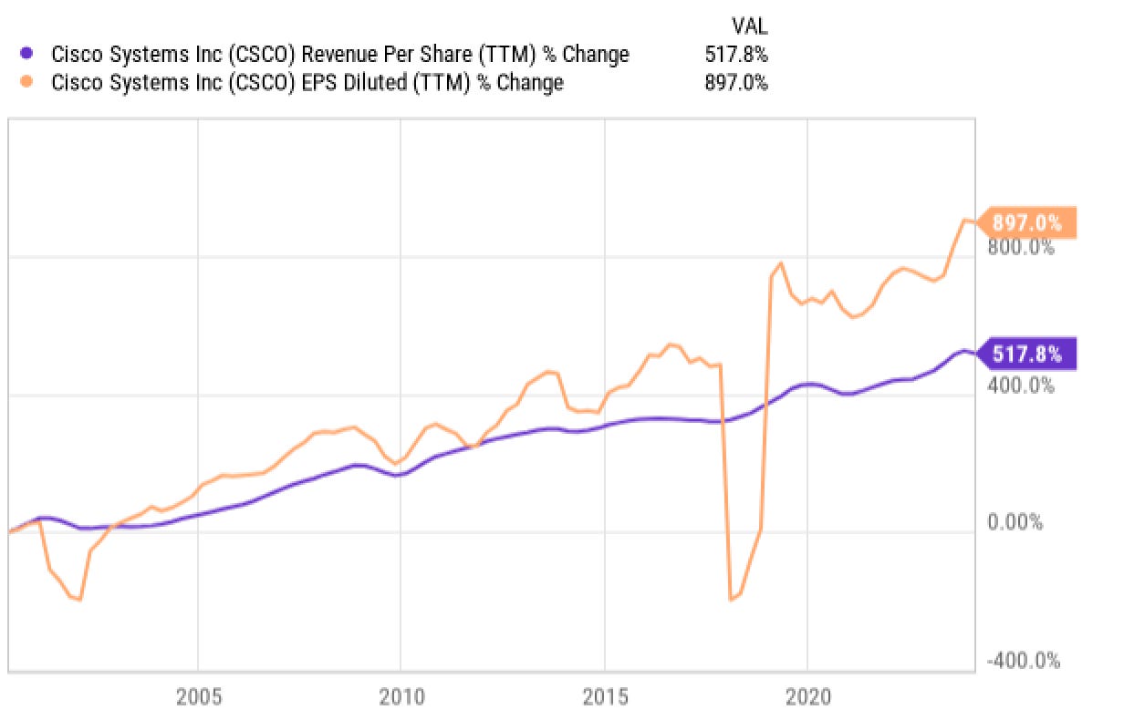 平心而论,自2000年以来,思科的基础业务取得了惊人增长。每股收入增长了500%以上,每股收益增长了897%。股价格却远低于2000年的峰值。对于投资者来说,尽管思科业务更强大、利润更高,但股价上它已经过气了。