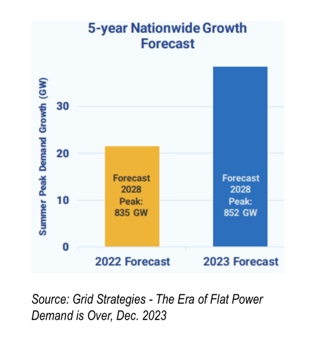 除了数据中心的新增需求,交通和建筑的电气化、新能源生产和更频繁的恶劣天气都在同时推高需求。(下图:5年全美电力需求预测。)