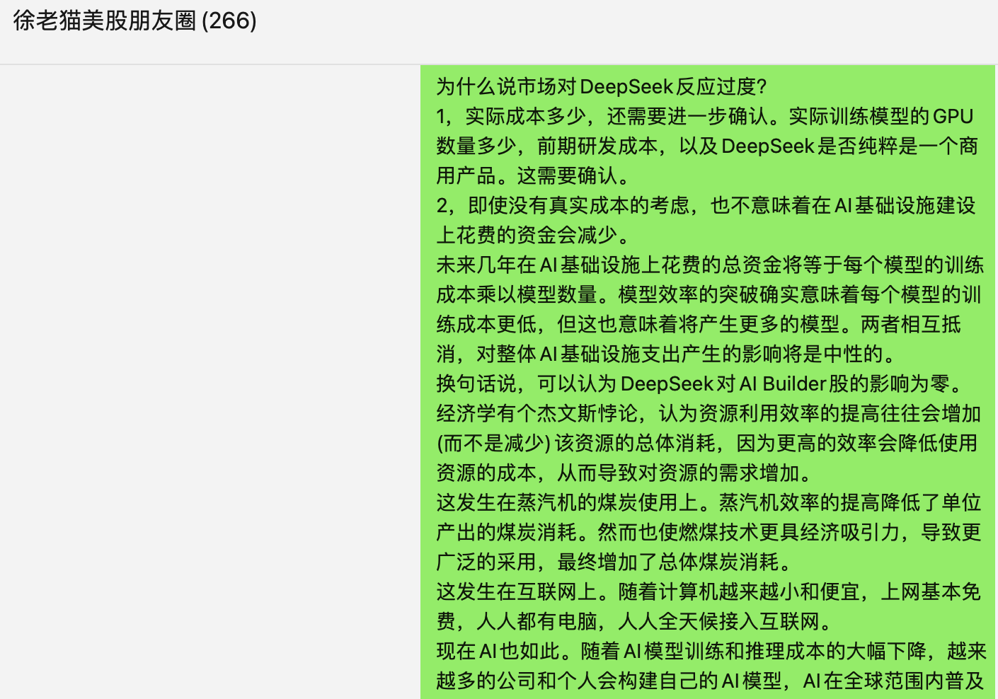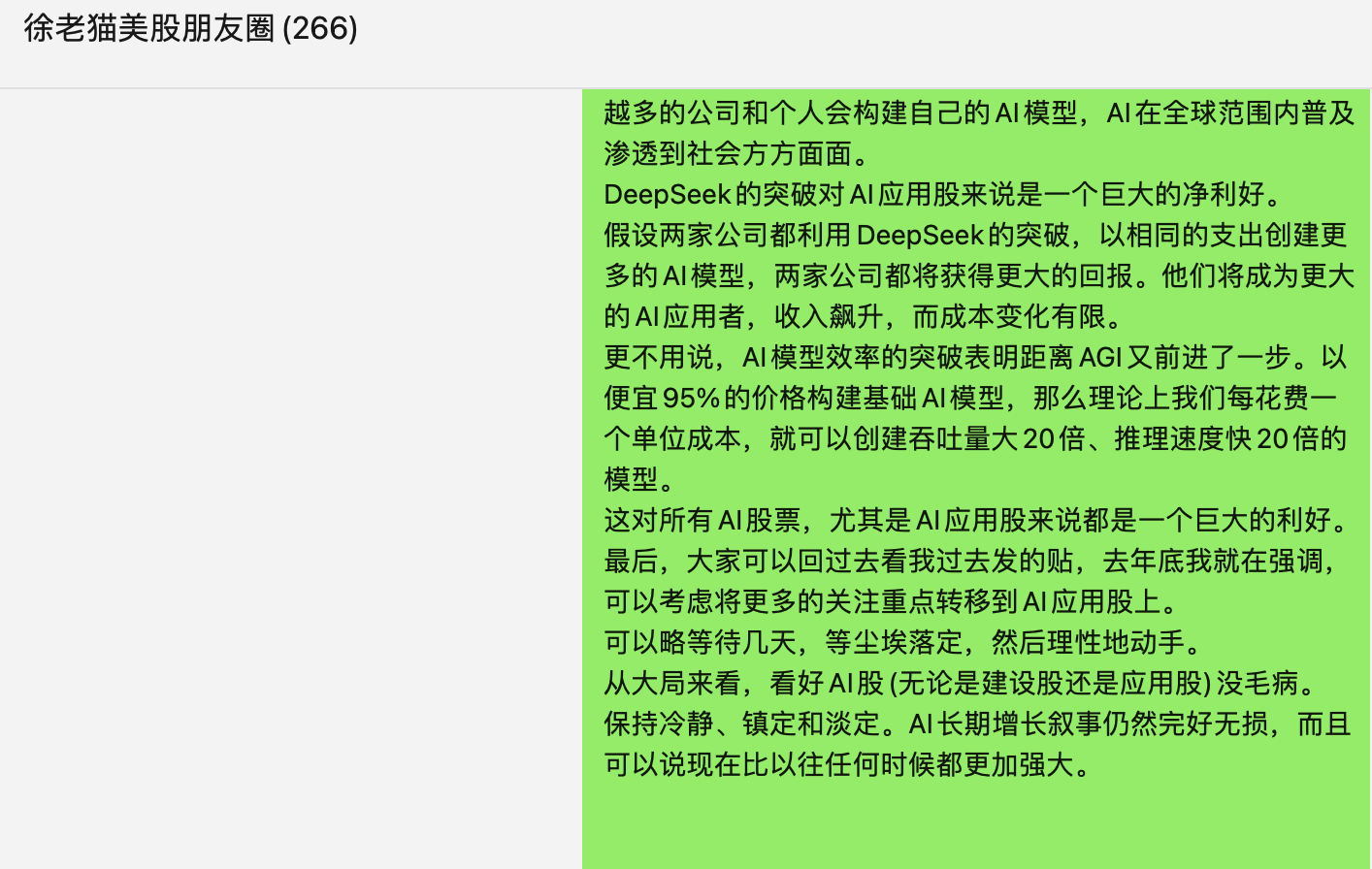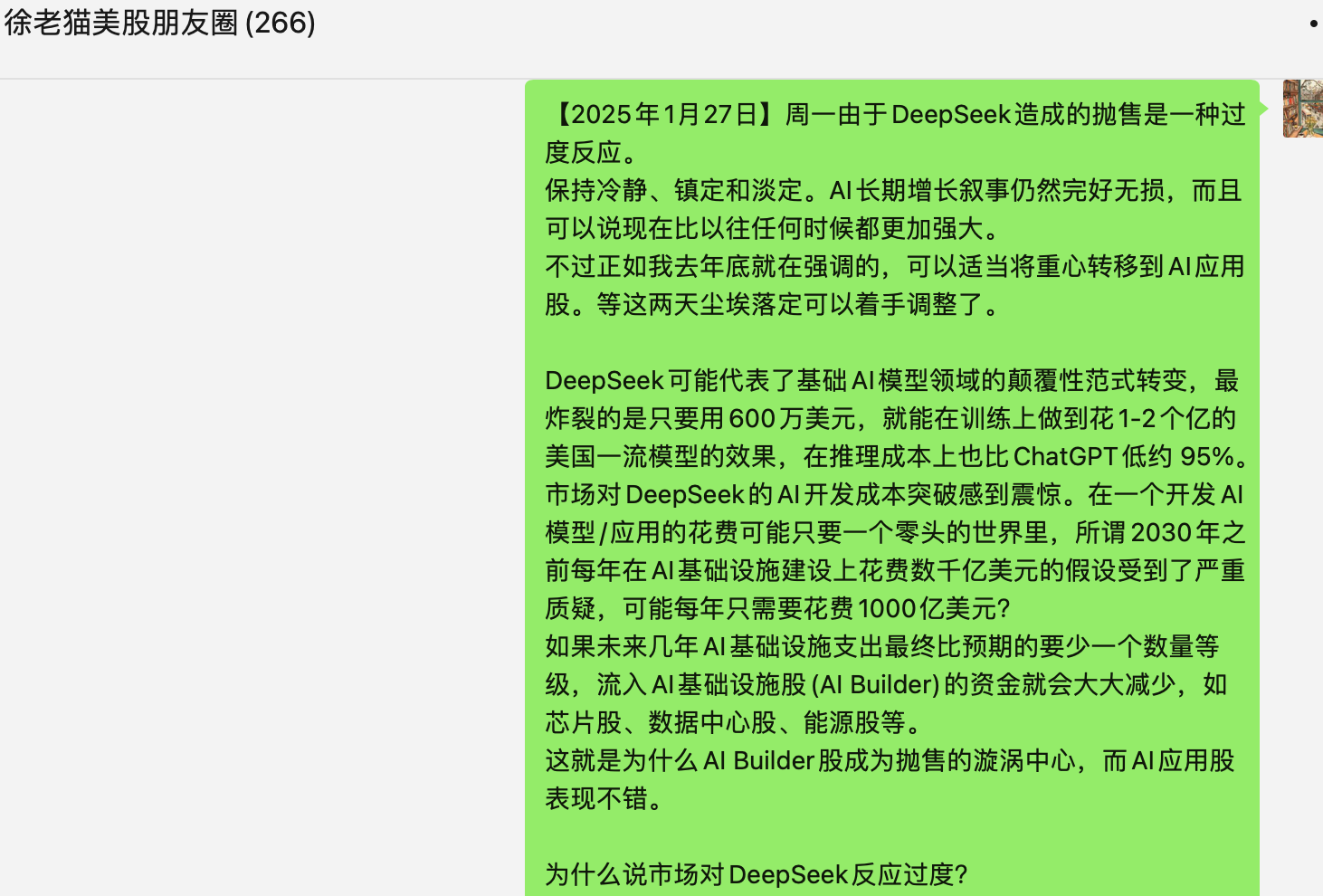 我们大致可以判断DeepSeek本质上并不会给AI上投资降温。但还是我去年底就在反复强调的,投资者需要将重点从AI基建股转移到AI应用股。