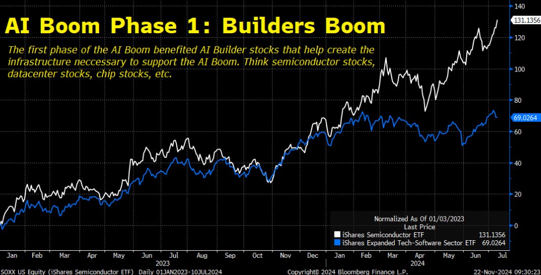 半导体股票是AI建设者很好的代表。过去两年半导体股引领了AI热潮,飙升约130%。与此同时,应用者(开发和应用新AI模型的软件公司)在同一时间段内仅上涨了70%。(下图)