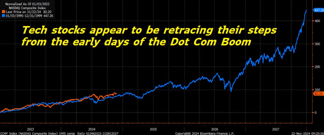 股票在一片泡沫的滋滋声中,追随着互联网泡沫中走过的脚步。(下图可见:整个互联网时代科技股的繁荣走向(蓝色),过去两年的AI股走的是一样的路数。)