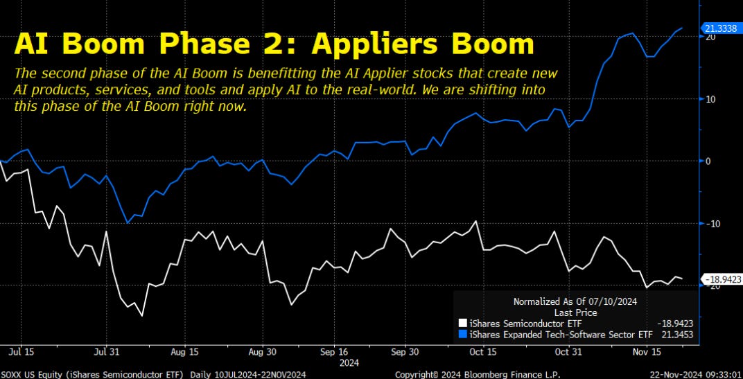 过去几个月发生了一些变化。自2024年7月中旬以来,AI应用者股票一直在压倒现有的基建股。软件股上涨20%,而半导体股下跌20%。(下图)