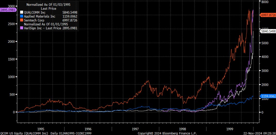 互联网泡沫之初的最大赢家都是互联网“基建股”,从1995年到1999年,高通(QCOM)涨了近6,000%;AppliedMaterials(AMAT)涨了约1,000%;Semtech(SMTC)涨了近7,000%,VeriSign(VRSN)飙升约3,000%。(下图)