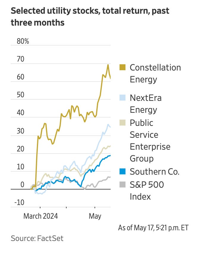 微软和亚马逊等大公司都在投入更多资源购买下一代芯片和建设数据中心,以推动AI的快速发展。数据中心需要更多的电力,投资者认为公用事业股票,尤其是那些专注于清洁能源和核电的股票将受益于需求激增。