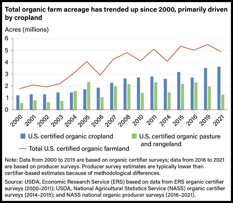 2022年,有机产品的销售额达到220亿美元,已经占美国所有水果和蔬菜销售的15%。美国有机贸易协会如此说,“有机食品的基本价值已经得到认可,消费者需求强烈,有机食品已经证明是抗经济周期的消费。不管任何情况,美国人都会对个人健康加大投资,也越来越重视环境。”