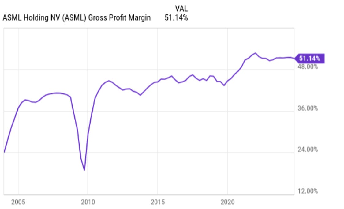 过去12个月其EBITDA和净收入利润率分别为33.8%和26.4%,可以说不是一般的厉害。由于四顾没有竞争对手,阿斯麦多年来可以一直提高毛利率(下图)。