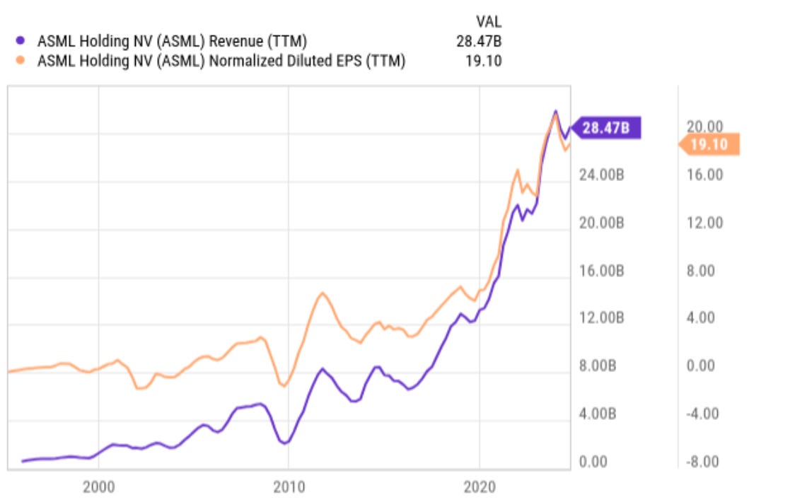 阿斯麦拥有压倒性的定价权,可以对一台EUV收取数亿欧的费用。这种竞争优势体现在财务业绩中,收入和EPS多年来一直呈快速上升趋势(下图)。