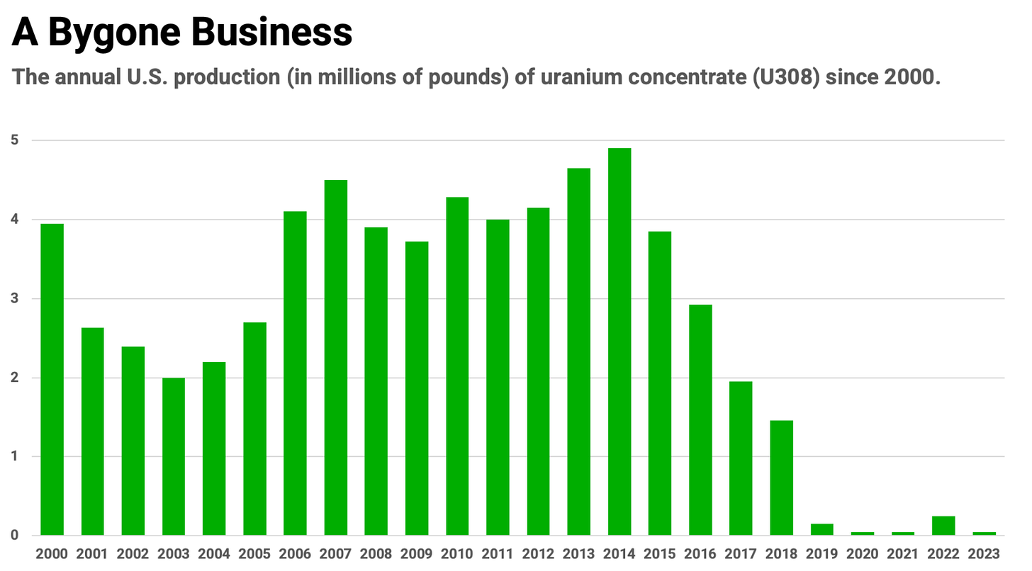 其次,俄罗斯铀开始从西方世界的供应链中消失。这是一个重大事件,因为俄罗斯每年向美国核公用事业供应铀约12%。自2022年2月俄乌战争以来,西方政府一直在试图结束对俄罗斯铀和燃料服务的依赖。例如《禁止俄罗斯铀进口法案》于两个月前全面生效。这项新立法禁止美国进口俄罗斯浓缩铀。