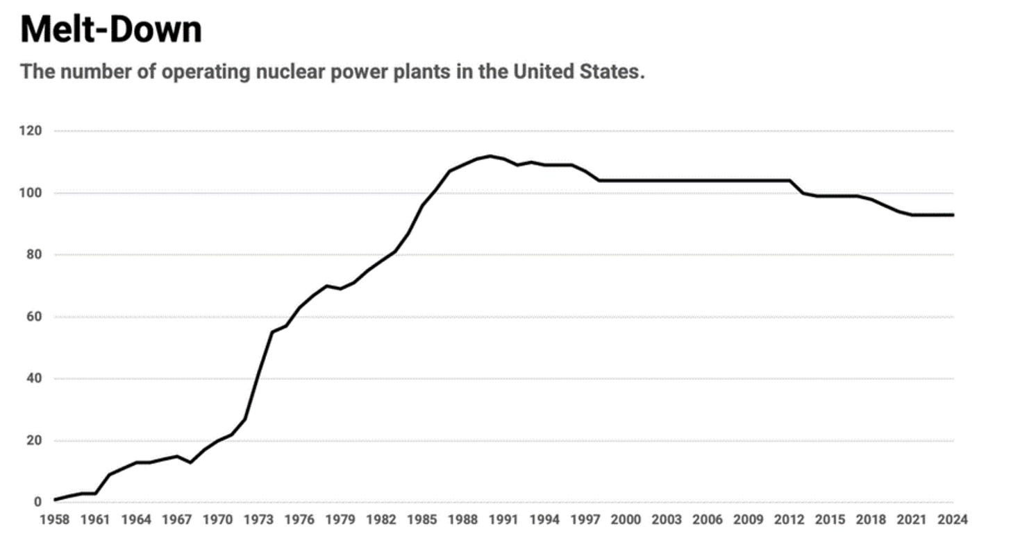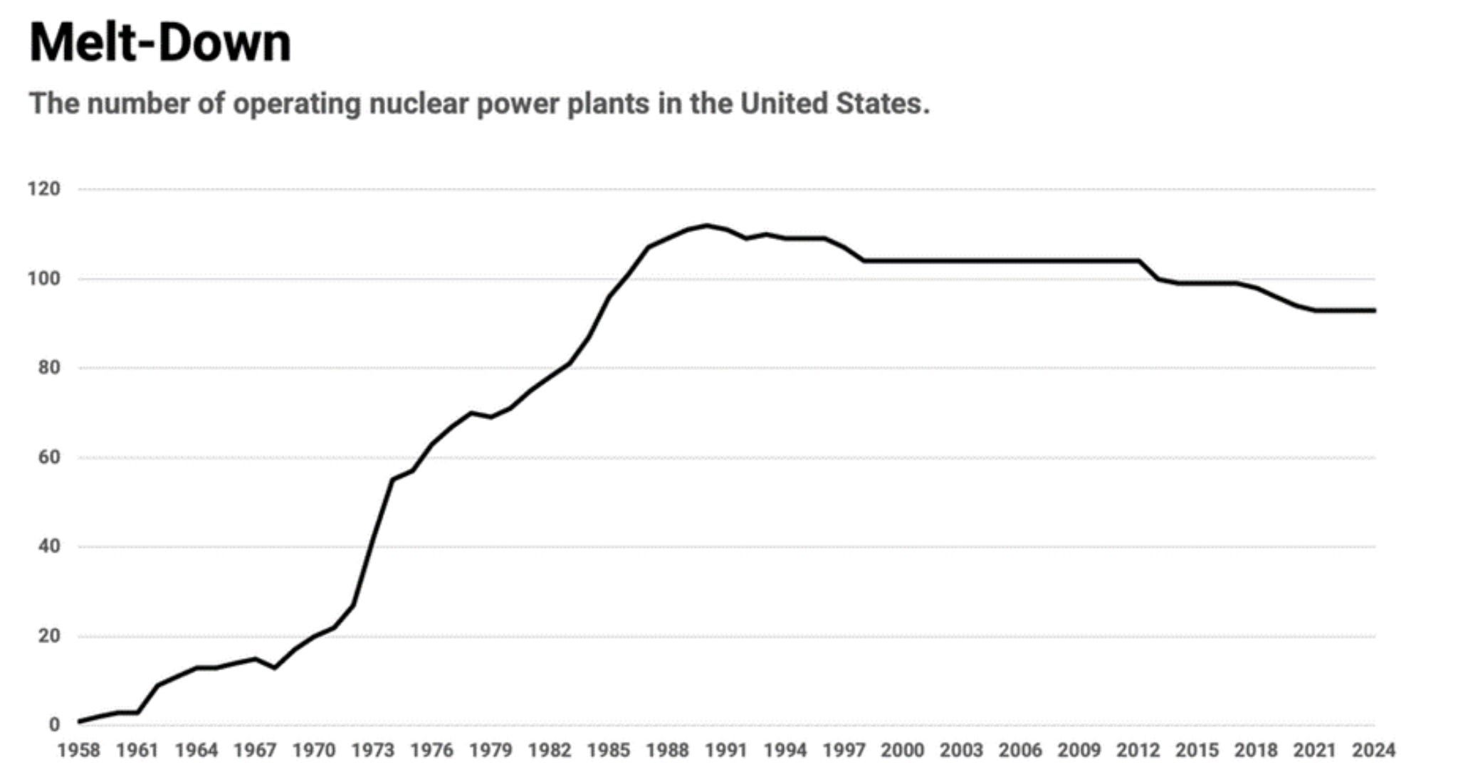 华尔街的一些分析师批评亚马逊和微软的核电交易“太贵了”,但他们忽略了科技行业电力需求的走势以及满足这一需求的困难。以现在的电价来看,亚马逊和微软可能付了过高的价格,但以未来的电价看,和未来对自备电力的需求下,它们可能抢占了先机。下图;美国核反应堆数量过去三十多年来一直处在缓慢下降中。