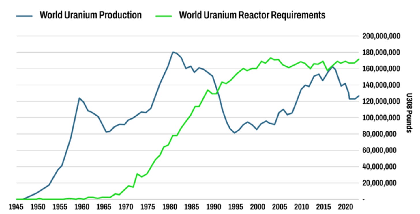推动铀牛市的主要因素一直是供需矛盾。首先,铀市场的结构性供应缺口正在扩大(下图)。据世界核协会的数据,铀矿供应仅占全球核工业每年消耗燃料的四分之三。剩下的25%来自“二次”供应,即军用武器级铀和核电设施的库存。由于二次供应数据的不透明,真正的供应缺口很难量化。不过大多数业内人士认为,近年来二级供应大幅下降,使得矿产供应对铀价的影响更为重要。