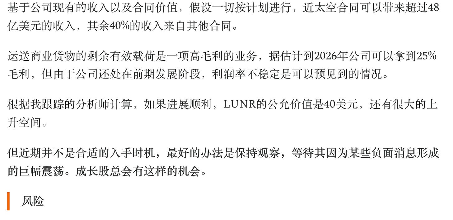 上述对LUNR的文章都不属于推荐。一方面我认可有可观的上升空间(基于业务进展顺利的前提下),但认为股价估值太高,风险偏大。因此一段时间内没有太大把握进行明确的买入判断(见下)。
