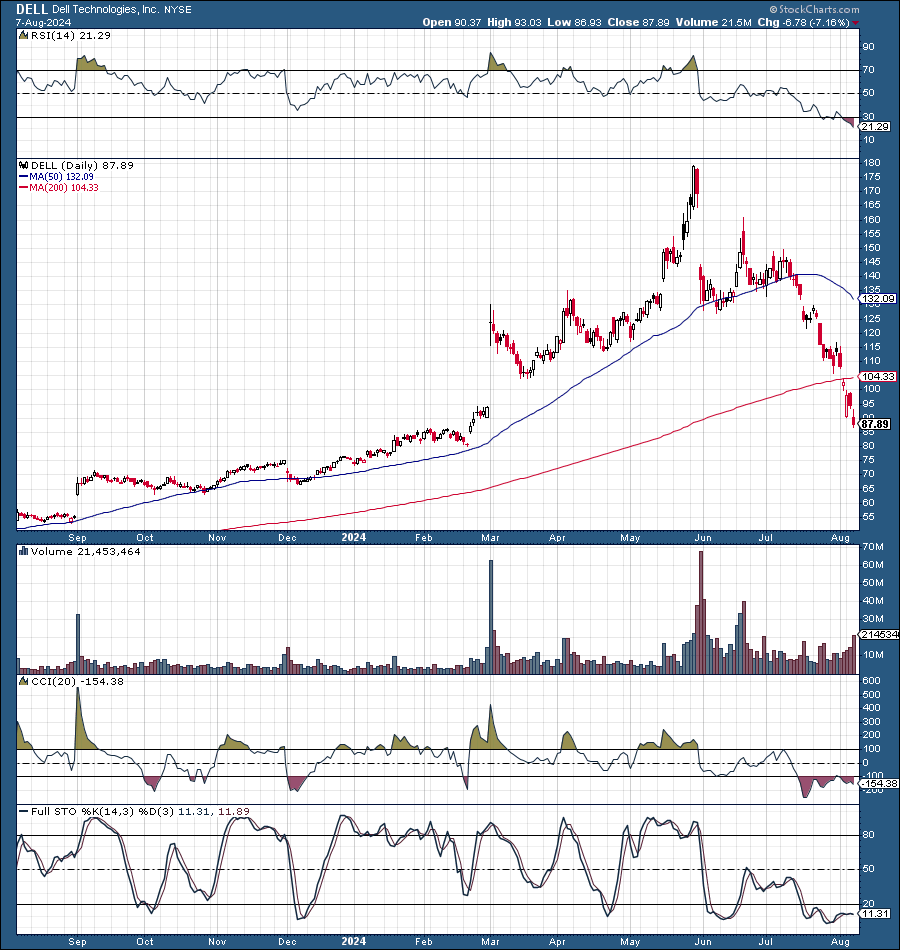 不仅是SMCI,另一家相似的AI硬件领导企业戴尔(DELL)几个月来也一直承受着巨大压力,经历了相当大的回调。下跌的幅度超出了许多人的想象,从最高150美元左右跌至一周前的90美元以下。RSI也逼近20,处于深度超卖。