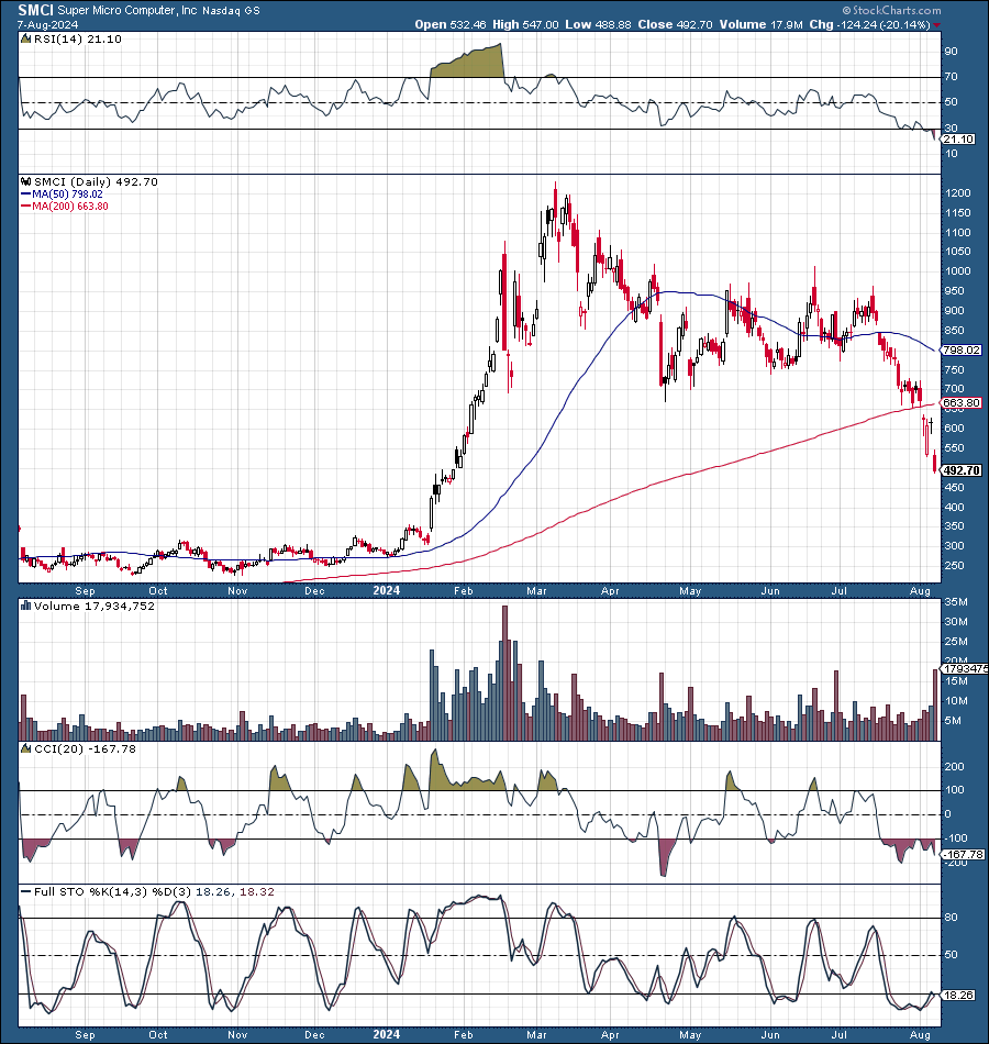 SuperMicro(SMCI)在发布好坏参半的盈利公告后,一个交易日内下跌了20%。从3月份的最高峰到低谷,SMCI跌去约60%,从1,200美元以上跌至一周前的500美元以下,交回了今年大部分的收益。